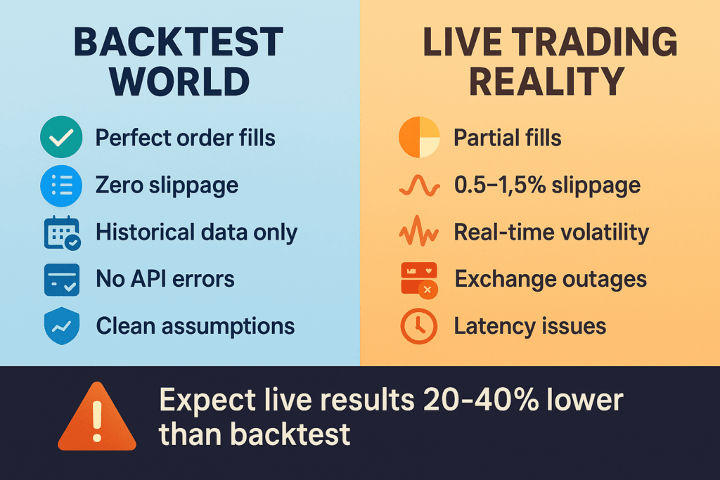 • Market regime shift (e.g., you tested a trend bot, but paper trading sits in chop)
