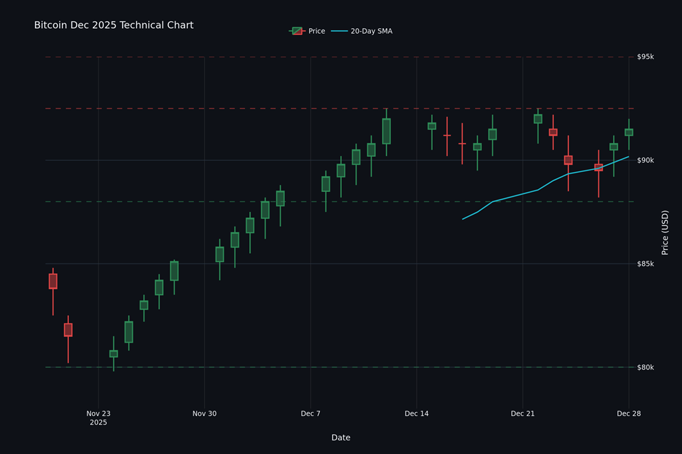 The chart above shows Bitcoin ‘s daily price action from late November through December 28, 2025. Key observations: