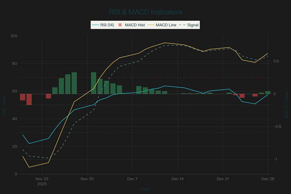 • Currently (late December) oscillating in the 50–65 range (neither overbought nor oversold; neutral to slightly bullish).