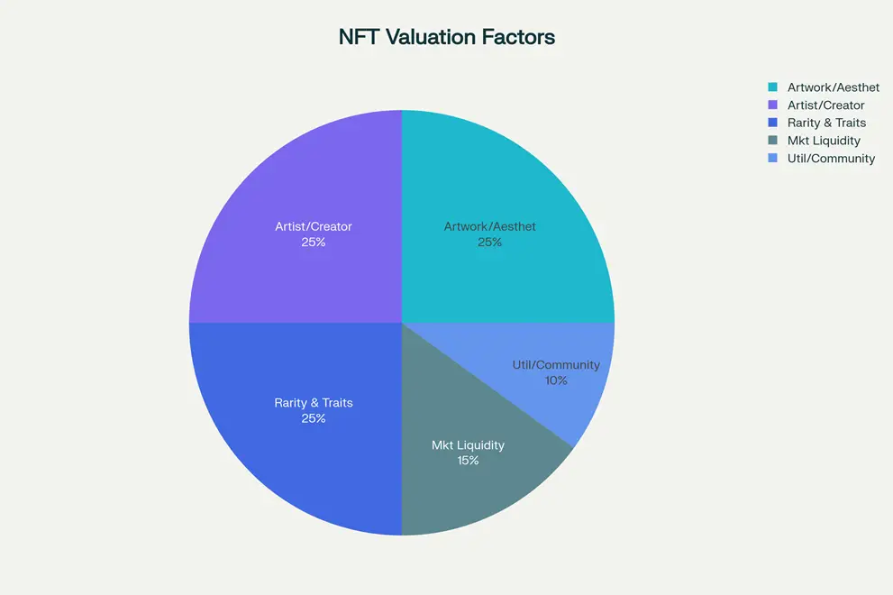 To understand AI NFT valuation, it helps to first revisit the fundamentals of NFT pricing. Research shows that NFTs are valued through a layered system where multiple factors interact dynamically. Traditional valuation drivers include: