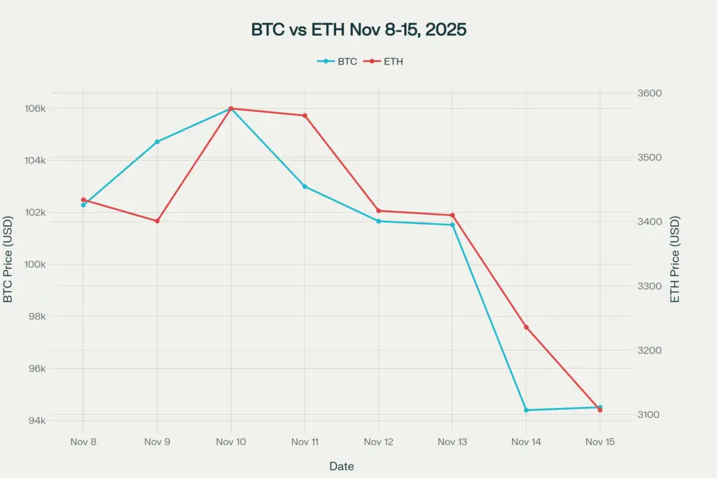 Bitcoin started the week near $102,282, briefly pushed above $105,000 on November 10, and then reversed violently. The sharpest move came on November 14, when BTC slid from about $99,700 to $94,400 in a single session. Ethereum tracked the same path, spiking to around $3,576 mid-week before cascading down to $3,107.