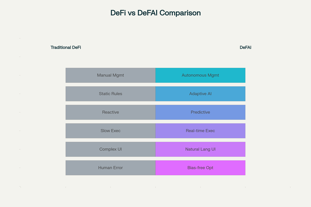 The fundamental difference between traditional DeFi and DeFAI lies in intelligence and autonomy. Traditional DeFi requires users to manually navigate complex protocols, understand tokenomics, monitor yield opportunities, and execute transactions themselves—a barrier that has limited mainstream adoption to only 14.2 million active wallets globally by mid-2025. In contrast, DeFAI systems function like a personal financial copilot, listening to user intent, analyzing vast datasets, and optimizing decisions based on market conditions and individual risk profiles. This shift from reactive, manual operations to proactive, AI-driven automation is attracting both retail users seeking simplicity and institutional investors demanding sophisticated strategies.