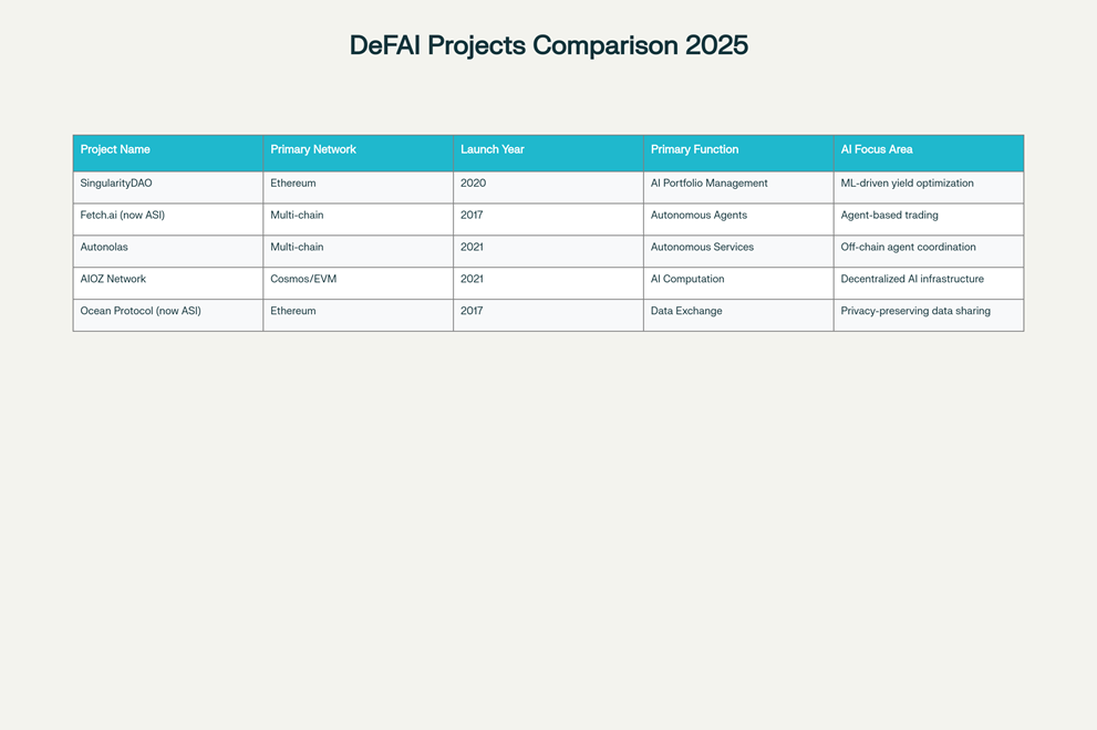The DeFAI ecosystem is rapidly maturing, with dozens of projects competing to become infrastructure and application layer leaders.