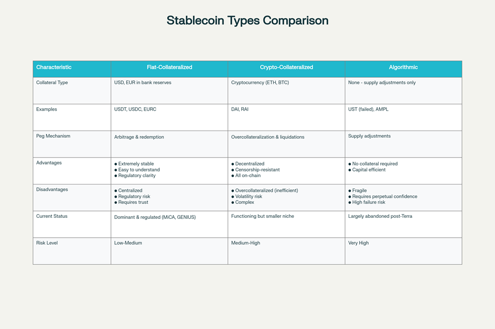 Stablecoins maintain their value through three fundamentally different mechanisms. Understanding which mechanism backs a stablecoin is crucial for assessing risk, because each model trades off centralization, efficiency, and resilience differently.