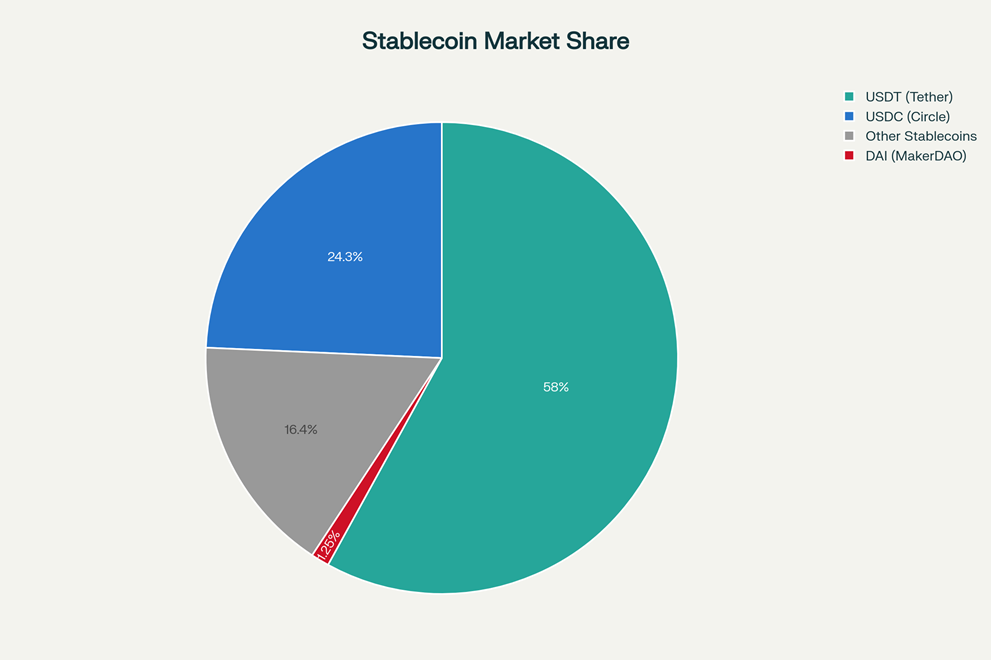 Market Position: $176.35 billion in circulation (58% market share). USDT is the oldest stablecoin (launched 2014) and the most widely supported across exchanges, blockchains, and DeFi protocols.