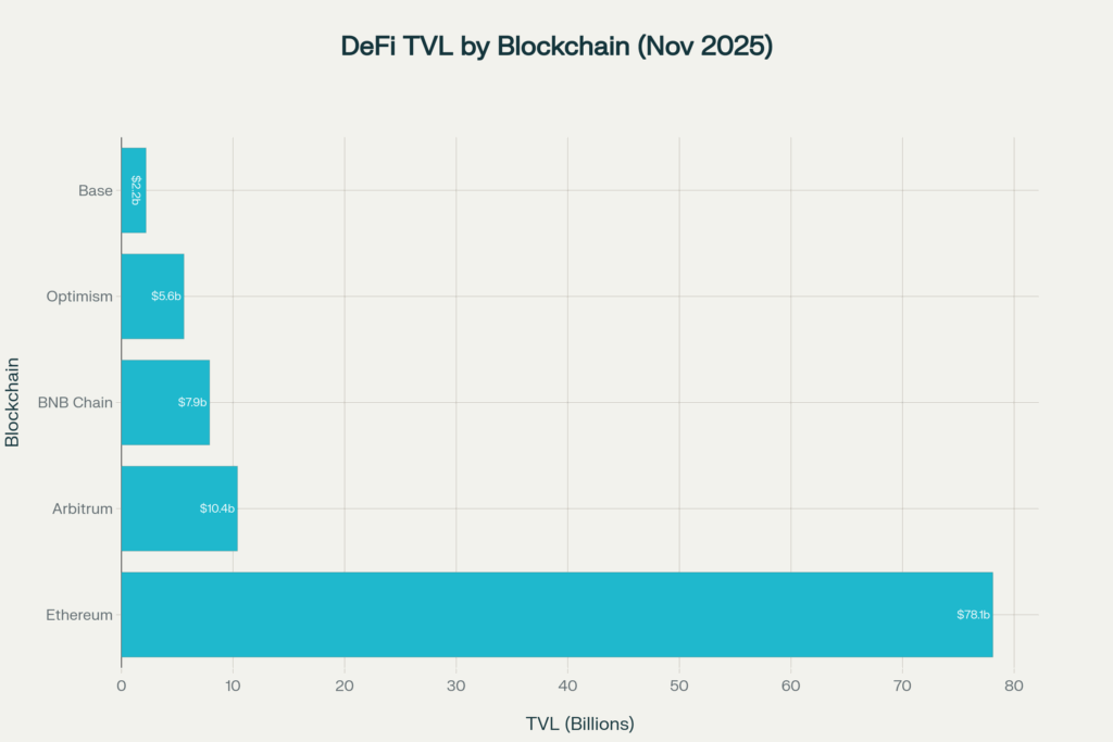 While Ethereum remains the backbone of DeFi with 63% of total TVL and $78.1 billion locked, the ecosystem has diversified across multiple chains: